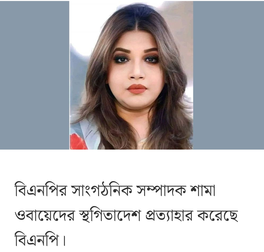 স্থগিতাদেশ প্রত্যাহারের বিবৃতিতে বলা হয়, গত ২১ আগস্ট বিভিন্ন অভিযোগের প্রেক্ষিতে বিএনপির সাংগঠনিক সম্পাদক (ফরিদপুর বিভাগ) শামা ওবায়েদের প্রাথমিক সদস্য পদসহ দলের সব পর্যায়ের পদ স্থগিত করা হয়েছিল। আজ তার স্থগিতাদেশ প্রত্যাহার করা ।